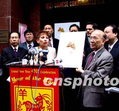 美國會議員維拉貴茲五日站在勿街中華公所門前舉起當(dāng)日出版的《每日新聞》報上登出的一條宣傳華埠沒有“非典”的公益廣告說,華埠是安全的,人們可以放心地到華埠來。(右一為中華公所主席伍廷典)中新社記者:趙海燕