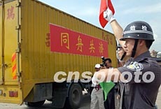 中央政府支援香港抗炎醫(yī)用物品交接儀式,五月八日在深圳皇崗口岸舉行, 滿載著抗炎物品的八輛集裝箱車從深圳皇崗口岸出發(fā)運(yùn)抵香港。中新社記者 錢興強(qiáng) 攝