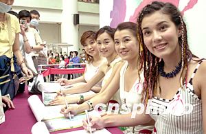 “2003年度香港小姐競選”5月10日在香港奧海城商場舉行簽名活動(dòng)。應(yīng)屆港姐冠軍林敏俐(右二)、亞軍左慧琪(右一)、季軍胡家惠(左一)等出席簽名宣傳活動(dòng)。鄧慶樂 攝