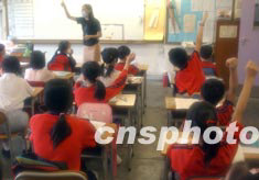 隨著香港“SARS”疫情的逐漸穩(wěn)定,香港數百所小學的高年級學生五月十二日開始復課。在灣仔學校復課的第一天,老師向學生提問有關如何防預“SARS”的基本知識。中新社記者 錢興強 攝