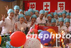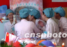 北京友誼醫(yī)院的白衣天使們十二日在院內(nèi)歡度護(hù)士節(jié)。迄今為止,北京友誼醫(yī)院已先后向抗擊“非典”一線派出兩批共計一百三十多名醫(yī)務(wù)工作者。中新社記者:武仲林
