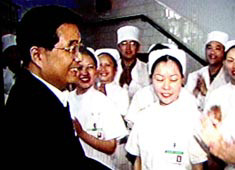 中新社北京五月十二日電 今天是國(guó)際護(hù)士節(jié),正在四川省考察農(nóng)村防治非典型肺炎工作的中共中央總書(shū)記、國(guó)家主席胡錦濤上午來(lái)到自貢市富順縣人民醫(yī)院,看望醫(yī)護(hù)人員,向廣大護(hù)士特別是奮戰(zhàn)在抗擊“非典”一線的全國(guó)護(hù)理工作者,致以節(jié)日的祝賀,并向廣大醫(yī)務(wù)人員表示親切的慰問(wèn)。