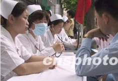 福建省立醫(yī)院護(hù)士,十二日在街頭向市民宣講嚴(yán)防“非典”科普知識(shí)。作者:劉可耕