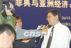 博鰲亞洲論壇《SARS與亞洲經(jīng)濟(jì)的影響評估與政策建議研討會(huì)》五月十三日開始在北京舉行,圖為出席會(huì)議的亞洲開發(fā)銀行北京辦事處首席經(jīng)濟(jì)學(xué)家湯敏接受記者訪問。