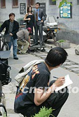 南海影業(yè)公司投資的電影《一百萬》攝制組作好人員防護,五月在北京什剎海附近的胡同里拍攝外景,拍攝進度并未受非典影響。中新社記者 滿會喬 攝