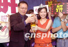 歌星關(guān)心妍5月14日在香港尖東Neway卡拉OK舉行的新歌祝捷會(huì)上,與唱片公司高層齊開香檳,慶祝其新歌《優(yōu)先訂座》在香港三大中文電臺于上周的播放率均名列三甲。中新社傳真 鄧慶樂 攝