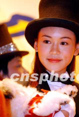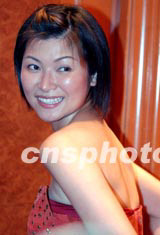 香港藝員黃卓玲,5月16日一身低胸露背裝出席《譴綣仙凡間》電視劇收視祝捷活動。中新社傳真 洪少葵 攝