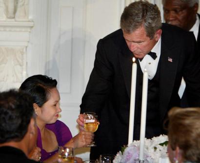 聽完布什總統(tǒng)的祝酒詞,阿羅約總統(tǒng)一飲而盡,并發(fā)表了她自己的祝酒詞,呼吁“進一步擴大這一正義的伙伴關(guān)系以完成志愿聯(lián)盟的更大任務(wù)!