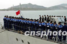 5月20日上午10時(shí),中國(guó)海軍艦艇部隊(duì)統(tǒng)一鳴笛一分鐘并下半旗,向在執(zhí)行訓(xùn)練任務(wù)中失事的361潛艇70名遇難官兵致哀。圖為沉浸在悲痛之中的導(dǎo)彈護(hù)衛(wèi)艦官兵正在下半旗,寄托對(duì)遇難戰(zhàn)友的哀思。作者:張全躍