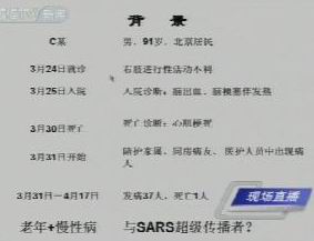 專家根據(jù)一個(gè)非典病人病例進(jìn)行分析指出,根據(jù)病人背景資料顯示,該病人是一位超級(jí)非典傳播者,該病人發(fā)病初期由于年齡過高并伴有其他病癥,故其非典病癥被忽略。由此也說明老年人如感染非典更容易成為病毒傳播者。