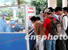 高考臨近,海南省在口岸設立接待處,對在外借讀返瓊的考生進行嚴格檢查,以防輸入性“非典”進入海南。作者:李建國