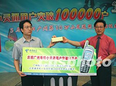 短短二十五天的時間里,廣州電信小靈通用戶突破十萬戶。廣州電信公司為二十三日產(chǎn)生的第十萬個小靈通用戶贈送紀念品。作者:鄧卓明