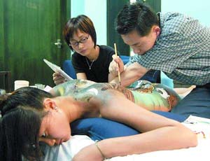 中新網(wǎng)5月30日電 據(jù)信息時(shí)報(bào)報(bào)道,昨天,中國首個(gè)人體彩繪展覽作品創(chuàng)作在廣州開筆。本次展覽的作品主要以中國的傳統(tǒng)國畫作品為主,這在中國乃至世界都尚屬首次,同時(shí)這也標(biāo)志著中國人體彩繪藝術(shù)將登上一個(gè)新的臺(tái)階,不再以西洋藝術(shù)為主導(dǎo),而轉(zhuǎn)向傳統(tǒng)的中國文化創(chuàng)作上。