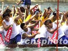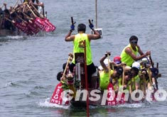 2003年澳門國際龍舟賽一日在澳門舉行,圖為澳門男子龍舟公開賽初賽中各隊奮力拚爭。 中新社記者 李剛