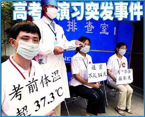 據(jù)北京青年報(bào)報(bào)道,昨天14點(diǎn)50分,101中學(xué)考點(diǎn)考生開(kāi)始進(jìn)入考點(diǎn)。由老師扮演的考生一一走過(guò)“驗(yàn)證處”,老師進(jìn)行嚴(yán)密排查,不久,“忘帶健康卡”、“考前體溫超過(guò)37.3攝氏度”、“返京不足14天”、“有‘非典’接觸史”、“健康卡兩章不全”、“忘帶準(zhǔn)考證”等各種“問(wèn)題考生”舉著醒目的標(biāo)牌,在引導(dǎo)老師的帶領(lǐng)下一一被臨時(shí)“安置”!皢(wèn)題考生”的問(wèn)題得到解決后,與其他考生一樣進(jìn)行體溫測(cè)試。進(jìn)入校門的考生在工作人員的指引下,先在臨時(shí)洗手池洗手消毒,然后按照考場(chǎng)示意圖去考場(chǎng)位置。