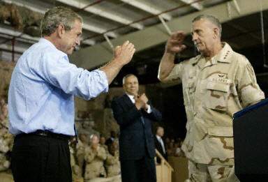 布什對(duì)2000名歡呼的美國(guó)空軍、海軍和陸軍軍人說(shuō):“這個(gè)人(薩達(dá)姆)花了數(shù)十年來(lái)隱藏他的大規(guī)模謀殺工具,他用來(lái)隱藏這些武器的地方很多,我們將尋找,我們將揭示事實(shí)。任何一個(gè)恐怖組織都將不能夠從伊拉克獲得大規(guī)模殺傷性武器,因?yàn)檫@一政權(quán)已經(jīng)崩潰。我們確保了伊拉克不會(huì)成為恐怖組織的武器庫(kù)。在伊拉克仍存在著零星的犯罪現(xiàn)象,聯(lián)軍正在伊拉克各地采取強(qiáng)有力的措施來(lái)使秩序恢復(fù)正常。美國(guó)和我們的盟國(guó)在使伊拉克的大街變得越來(lái)越安全。”