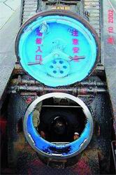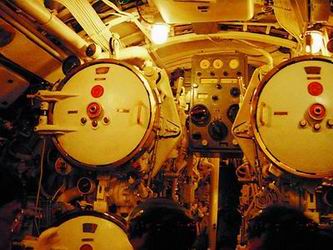 打開潛艇前部的一個艙蓋,只看到舷梯下面一片昏暗。這樣的進(jìn)出艙口,在潛艇上部共有3個。艙口的直徑也就0.6米到0.7米寬,剛剛夠一個成年人進(jìn)出。從陽光燦爛的露天走下舷梯,眼前一團(tuán)漆黑,過了一會兒,漸漸才能看見艙內(nèi)密布的儀表、管道、閥門。原來,為了節(jié)約能源和適應(yīng)水下作業(yè)的壓力,潛艇內(nèi)使用的都是光線昏黃的防爆燈,燈泡的外面還用小拇指寬的鐵條箍住。