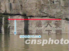 三峽水利樞紐壩前水位6月6日上午10時,達到121.41米。瞿塘峽平湖景象已呈現(xiàn)出來,而三峽著名的夔門摩崖石刻此時已經(jīng)被淹沒。圖為6月4日當(dāng)水位達到116.33米時,夔門摩崖石刻向游人展示出告別前的景觀。中新社 圖