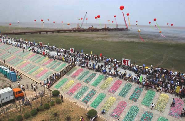 中新網(wǎng)6月8日電 杭州灣跨海大橋工程奠基儀式今天下午2時(shí)16分在慈溪市庵東鎮(zhèn)杭州灣大橋工程指揮部氣墊船專用碼頭舉行。