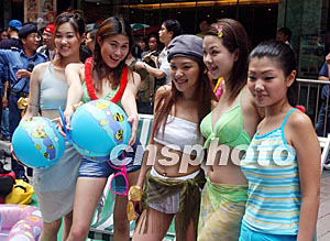 為刺激消費市道和營造復蘇氣氛,香港從六月八日起在灣仔駱克道舉行星光之夜活動。圖為數(shù)十名模特穿上泳裝在街頭巡游。潘索菲 攝