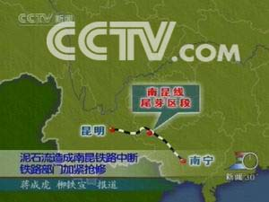 據(jù)中央電視臺報道,9日零時,因連降暴雨,南昆鐵路尾芽區(qū)段多處被泥石流掩埋道床、沖空線路。尤其是總長3公里的盤龍山隧道口塌下1萬立方米的泥石流,導(dǎo)致近百米線路被掩埋,厚度達(dá)6米,隧道內(nèi)有一公里多線路嚴(yán)重積水,有些險段搶險人員一時無法接近,給搶險工作增加了很大難度。