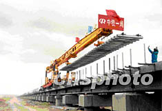 六月十二日清晨,青藏鐵路鋪軌順利通過海拔四千六百多米、全長十一點七公里的清水河特大橋。清水河特大橋位于可可西里無人區(qū),是青藏鐵路最長的以橋代路工程和重點控制工程之一!耙詷虼贰敝饕菫榻鉀Q高原凍土地帶路基穩(wěn)定問題,各橋墩間的一千三百多個橋孔可供藏羚羊等野生動物自由遷徙。作者:趙匡胤