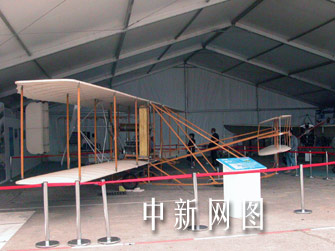 離博物館幾步路之遠(yuǎn)的一個(gè)人字型展棚里,陳列著一九零三年十二月十七日懷特兄弟駕上天的那架簡(jiǎn)陋飛機(jī)的復(fù)制品,懷特兄弟短短五十九秒的空中飛行,揭開(kāi)了人類征服地球引力的光輝篇章。