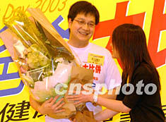 為歡度一年一度的父親節(jié),香港時代廣場六月十五日舉行“做個健康爸爸努力保護頭家”活動,圖為一位患“非典”家屬向醫(yī)生獻上鮮花致意。錢興強 攝