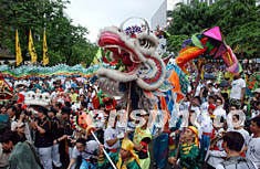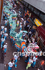 六月十五日在香港舉行的千人舞龍舞獅大巡游中,一條二百五十尺長(zhǎng)龍穿街走巷,成為活動(dòng)中一道亮麗風(fēng)景。潘索菲 攝