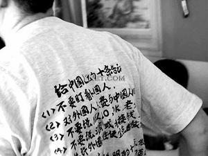 據(jù)《現(xiàn)代快報》報道,該外籍男子當(dāng)時身著一件后背印有字跡的T恤,上面寫著“給中國人十條告誡”,如“(1)不許盯看外國人,(2)不要跟外國人說HELLO、OK,(3)允許外國人住便宜旅館”等內(nèi)容。在場的兩位市民許先生和陳先生對“老外”T恤上的文字表示不滿,當(dāng)即上前讓其脫下該衣服,在場的其他市民也紛紛附和。