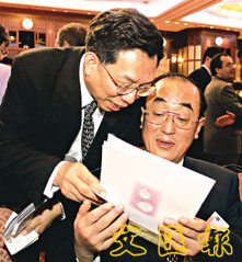 中國衛(wèi)生部常務(wù)副部長高強(qiáng)(右)與臺灣當(dāng)局“疾管局長”蘇益仁在馬來西亞舉行的世衛(wèi)全球SARS研討會上。