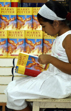 在全球書迷的引頸期盼下,風靡世界的暢銷兒童讀物《哈利·波特》系列第五集《哈利·波特和鳳凰的指令》終于在格林尼治時間20日23時(北京時間21日上午7時)全球同步發(fā)行。