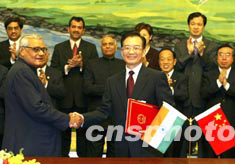 中新社北京六月二十三日電 中國國務(wù)院總理溫家寶與印度總理瓦杰帕伊二十三日晚在北京人民大會堂共同簽署了《中華人民共和國和印度共和國關(guān)系原則和全面合作的宣言》。