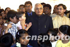 印度總理瓦杰帕伊二十三日在北京出席印度駐華使館新址奠基揭幕儀式時(shí),與在華的印度兒童簇?fù)斫徽劇V行律缬浾?毛建軍