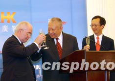 香港特首董建華、財(cái)政司長(zhǎng)梁錦松及投資推廣署長(zhǎng)盧維思,6月24日在禮賓府特設(shè)酒會(huì),舉杯祝賀來(lái)港投資的中外企業(yè)代表在港開(kāi)業(yè)擴(kuò)充業(yè)務(wù)。 中新社記者 洪少葵