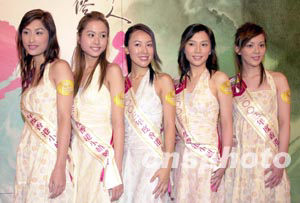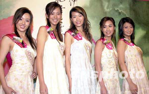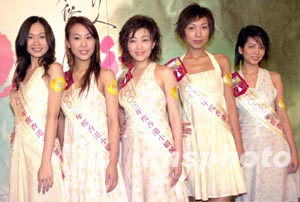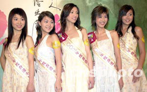 「2003年香港小姐競(jìng)選」6月26日舉行「鉆石肌膚獎(jiǎng)」記者會(huì),二十位候選佳麗再度亮相,圖為11─15號(hào)候選佳麗,楊洛婷、吳幸美、詹德貞、鄧源慧、陳榕梅 (左起)。 中新社記者 鄧慶樂(lè)