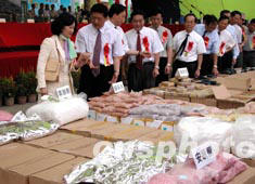 中新社廣州六月二十六日電 (唐貴江陳瑞光)二00三年粵港澳“六·二六”國(guó)際禁毒日聯(lián)合銷毀毒品大會(huì)二十六日上午在廣州舉行,公開銷毀了警方繳獲的海洛因、冰毒、搖頭丸等各類毒品共五噸。