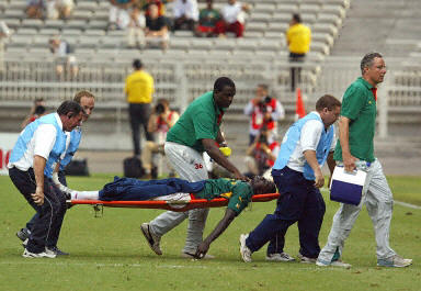 喀麥隆隊憑借前鋒恩迪埃菲在上半場第九分鐘攻進的一球,在里昂以1比0淘汰了哥倫比亞隊,也躋身決賽。但比賽進行到第七十二分鐘時,喀麥隆中場球員馬克-維維安·福突然自己在中場倒地,不省人事,被立即抬出場地后經(jīng)搶救無效死亡。