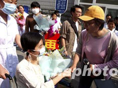 香港鳳凰衛(wèi)視記者劉海若六月二十七日來到北京宣武醫(yī)院,采訪這家專治非典重癥患者醫(yī)院的最后一名痊愈者出院。中新社記者:賈國榮