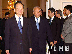 六月二十九日,國(guó)務(wù)院總理溫家寶訪港,圖為香港特首董建華在禮賓府迎候溫家寶。中新社記者 潘索菲 攝