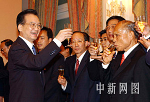 六月二十九日,國(guó)務(wù)院總理溫家寶在香港見證“內(nèi)地與香港更緊密經(jīng)貿(mào)關(guān)系安排”簽字儀式,圖為溫家寶在簽字儀式上向香港知名人士祝酒。中新社記者 潘索菲 攝
