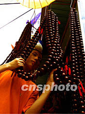 六月三十日,一名小男孩在北京一處寺廟旅游圣地選擇旅游紀(jì)念品。北京旅游“禁令”解除后,旅游紀(jì)念品攤點(diǎn)爭(zhēng)相開(kāi)業(yè),以減少“非典”造成的損失。中新社記者 宋吉河 攝