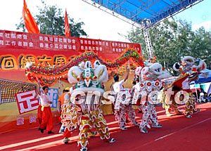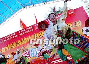 為慶祝香港回歸祖國六周年,香港十個團體合作籌辦的“慶;貧w祖國六周年足球嘉年華”一連三天在維園舉行。圖為7月1日典禮儀式上龍獅起舞,歡慶佳節(jié)。洪少葵 攝