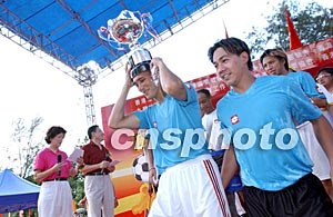 在香港慶;貧w祖國六周年足球嘉年華比賽中,獲得冠軍的香港漁民互助社足球隊興高彩烈上臺領(lǐng)獎。洪少葵 攝