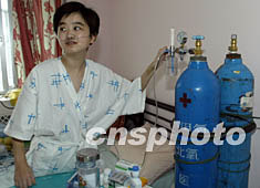 7月2日,三十歲的楊冬梅在陽光明媚的家中熟練地操作吸氧開關。楊冬梅5月16日身染SARS病毒后病情危殆,經(jīng)過有創(chuàng)機械通氣等治療搶救奇跡般康復,上周五從宣武醫(yī)院出院。她是北京數(shù)十名采用有創(chuàng)機械通氣治療患者中幸存的三人之一,目前在家中間斷吸氧和服藥,精神和身體狀況一天比一天好。中新社記者 任晨鳴 攝