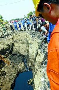 12時許,經(jīng)過緊張挖掘,維修人員在地面以下3米的“穿路套管”處,發(fā)現(xiàn)泄漏出來的原油,記者看到這里油如泉涌。據(jù)現(xiàn)場的技術人員介紹,從現(xiàn)場情況看來,泄漏情況比較嚴重,必須把這段長約24米的“穿路套管”打開后才能進行維修。