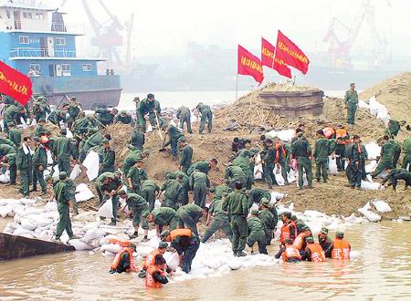 記者今天上午在現(xiàn)場(chǎng)看到武警上?傟(duì)第9支隊(duì)3中隊(duì)的數(shù)百名官兵身穿桔紅色救生衣,有的在碼頭上搬運(yùn)沙袋,有的站在齊腰深的積水里修筑堤壩。這些戰(zhàn)士們從昨天凌晨進(jìn)入現(xiàn)場(chǎng)搶險(xiǎn)后,分批投入戰(zhàn)斗,至記者發(fā)稿時(shí)已經(jīng)連續(xù)戰(zhàn)斗了30多個(gè)小時(shí)。
