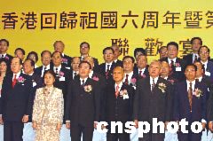 中新網7月4日電 香港廣東社團總會昨晚在香港會議展覽中心五樓大會堂隆重舉行“慶祝香港回歸祖國六周年聯(lián)歡宴會”。全國政協(xié)副主席霍英東﹑行政長官董建華等蒞臨主禮。