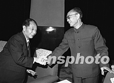 中國著名軍事家張愛萍上將,因病于七月五日二十時三十五分在北京逝世,享年九十三歲。圖為1984年4月30日晚,張愛萍(右)與胡耀邦在北京人民大會堂出席國防科工委慶祝試驗通信衛(wèi)星發(fā)射成功大會上親切握手。作者:鄭瑞德