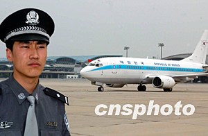 韓國總統(tǒng)盧武鉉七日乘專機飛抵北京開始其訪華行程,機場人員加強警戒確保安全。中新社記者:滿會喬